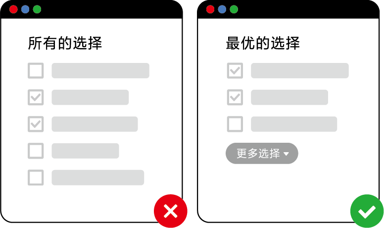 又称选择超载。当出现太多选择时,我们的大脑就会瘫痪,很难进行选择。