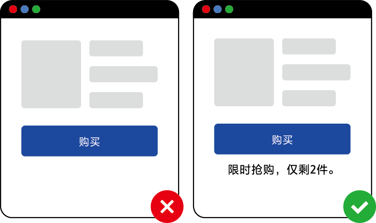 使用“限时优惠”,“有限数量” 等修辞来形容你的产品或服务。给人的印象是许多人正观看此项目,并随时可以抢走最后的几件物品。