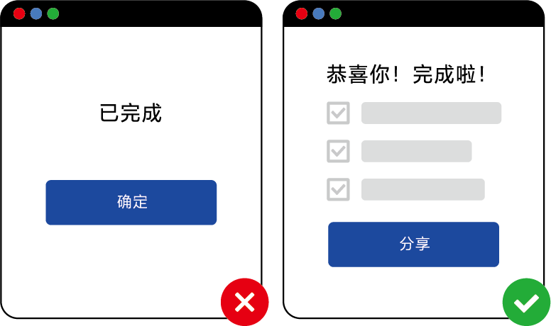 在用户做出购买决定并成功达成交易之后,是用户分享产品(或添加评论)的绝佳时机;显示肯定的信息,并祝贺他们达成了这一步骤以激励用户。